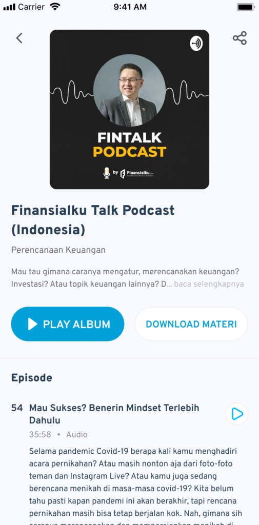 4. Audiobook yang sifatnya gratis hanya memiliki dua opsi tombol, yaitu ‘PLAY ALBUM’ dan ‘DOWNLOAD MATERI’.