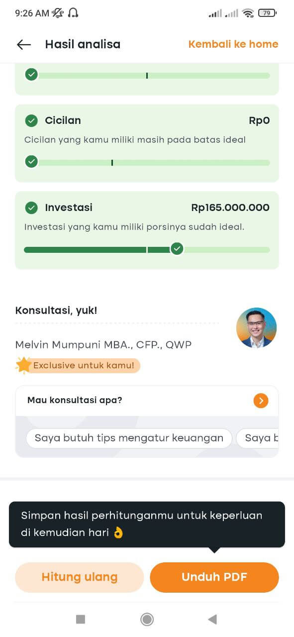 29. Kamu bisa simpan hasil perhitunganmu dengan klik unduh Pdf, untuk keperluan saat berkonsultasi dengan CFP.