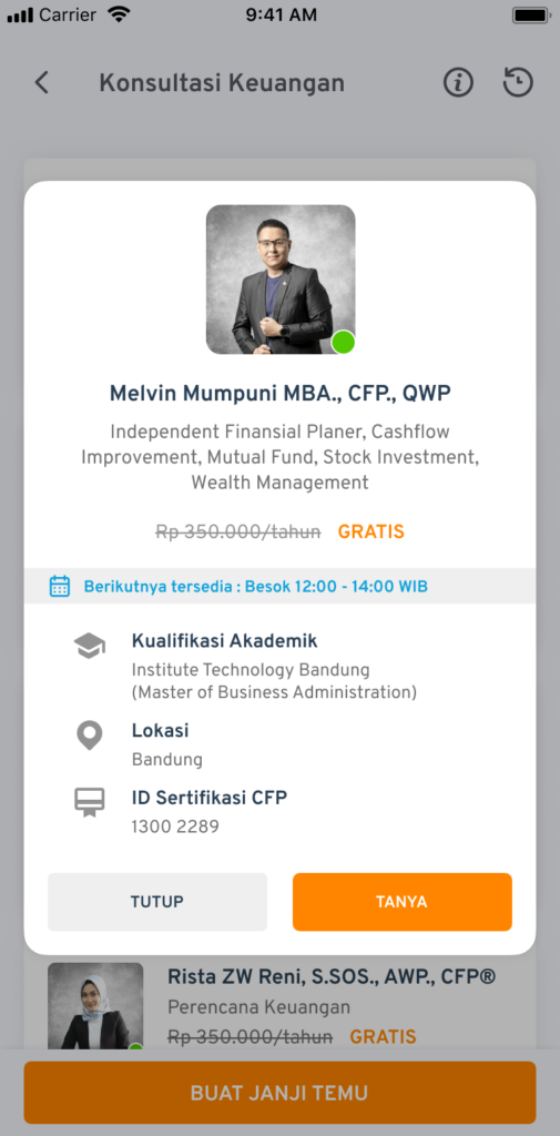 3. Akan muncul satu kotak dialog ketika Anda menekan profil dari salah satu perencana keuangan Finansialku. Tekan ‘TANYA’ untuk melanjutkan.
