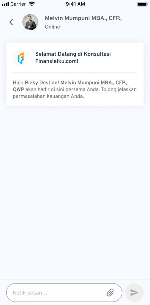 4. Setelah itu, Anda akan masuk ke halaman chat, dan memulai konsultasi dengan perencana keuangan pilihan Anda.