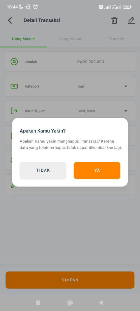 Menghapus Catatan Pemasukan Author: Finansialku Helper 980 views 1. Pilih transaksi yang akan dihapus2. Pilih tombol dengan ikon ‘tempat sampah’ di pojok kanan atas3. Tekan ‘SIMPAN’ kalau sudah selesai. Still stuck? How can we help? Apakah artikel ini berguna? Yes No A premium WordPress theme with an integrated Knowledge Base, providing 24/7 community-based support. Send