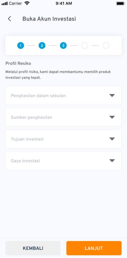 3. Di halaman ketiga, Anda diharuskan untuk mengisi profil risiko investasi Anda. Pada halaman ini, usahakan untuk menjawabnya dengan jujur, ya.