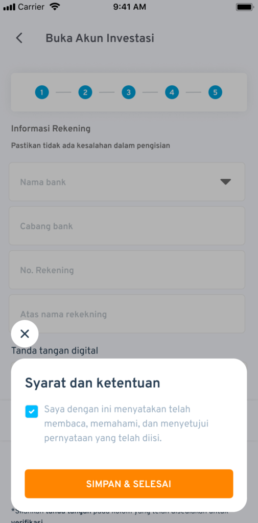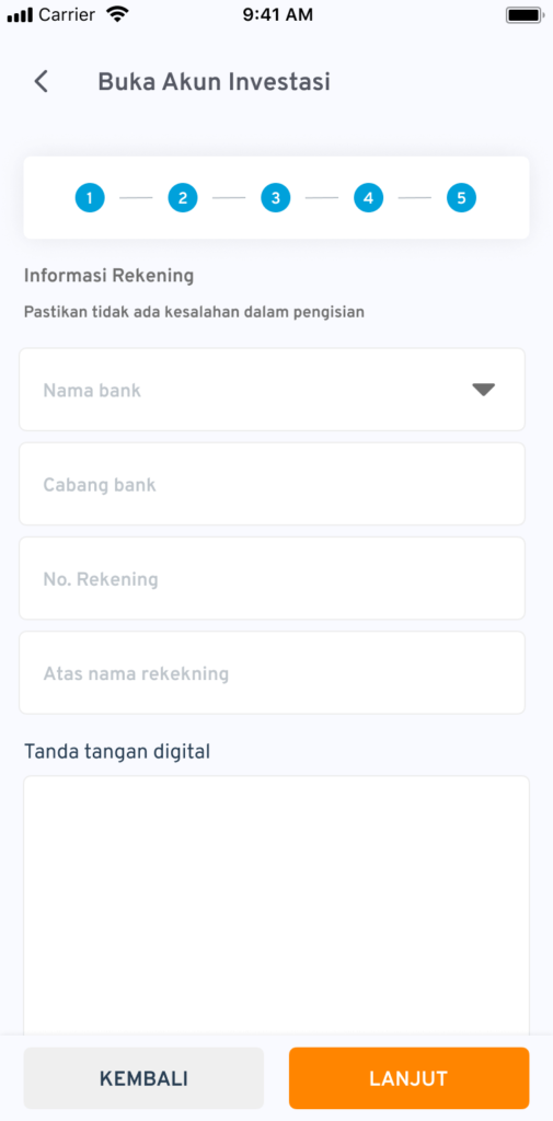 5. Di halaman kelima, Anda diharuskan untuk mengisi data terkait rekening yang akan dijadikan rekening utama untuk transaksi reksa dana nantinya.