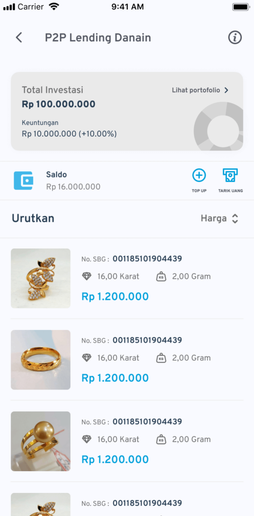 - Total Investasi, yang menunjukkan informasi tentang jumlah dana yang sudah diinvestasikan, jumlah keuntungan yang sudah didapatkan saat ini, dan portofolio investasi P2P Lending Anda.