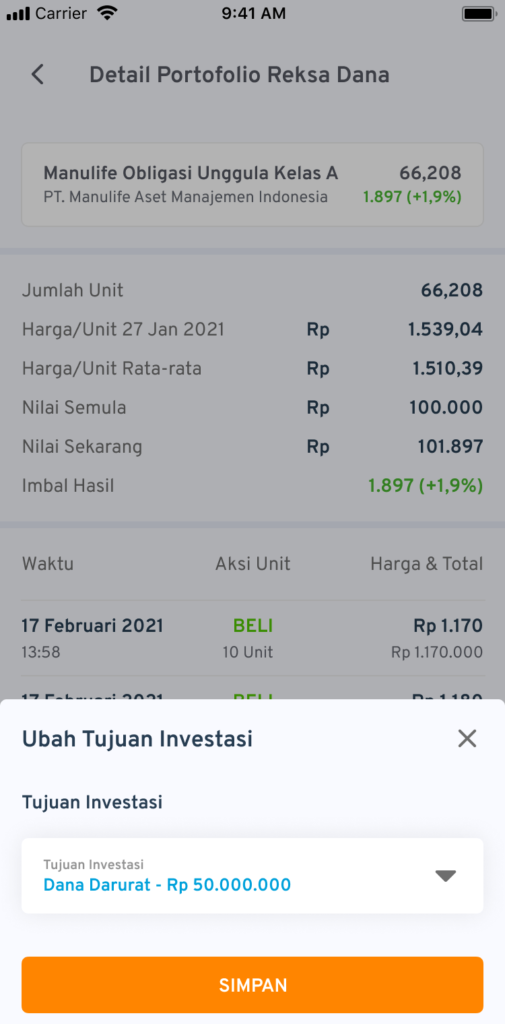 4. Sementara itu, jika Anda ingin mengubah tujuan investasi, Anda bisa menekan tombol ‘Ubah Tujuan Investasi’ hingga muncul kotak dialog seperti gambar di bawah ini.